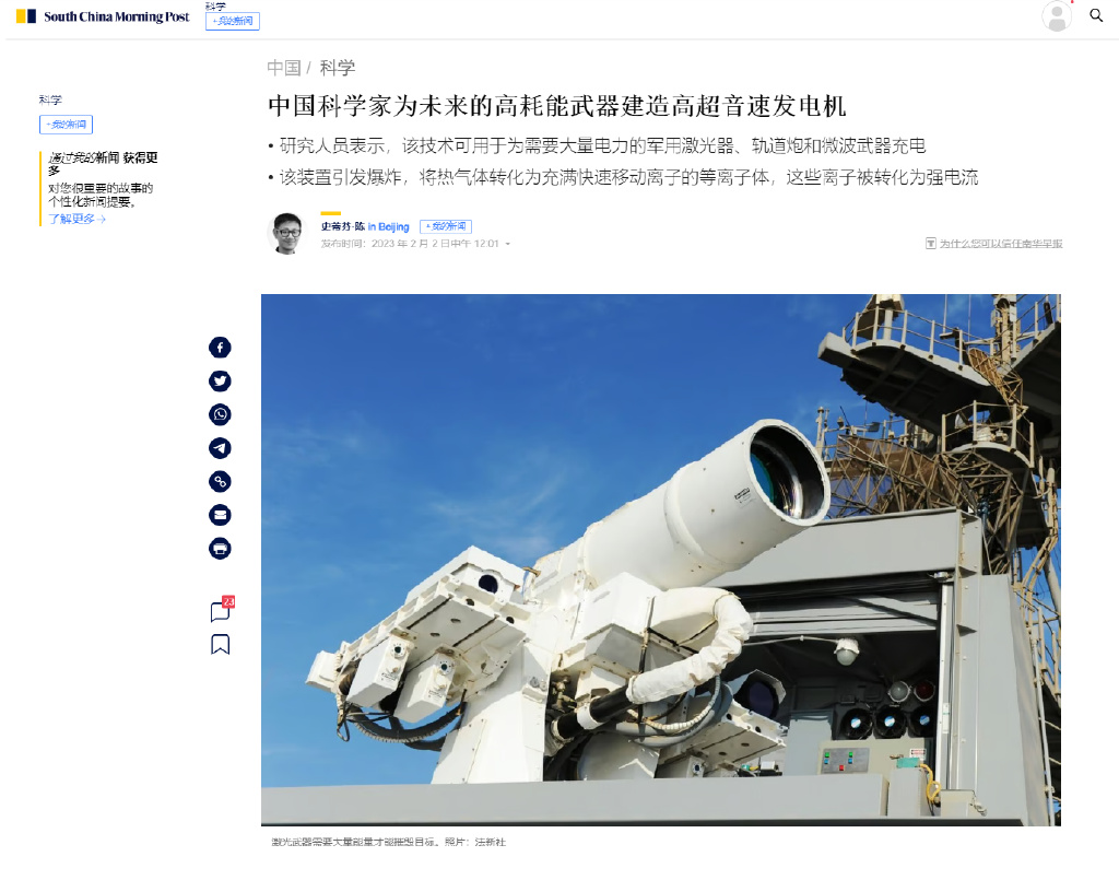 2月2日,《南华早报》报道了中国科学家在高能脉冲领域的一大突破,爆轰驱动惰性等离子气体致高超音速发电机获得突破性进展,未来将可以为军用激光器、轨道炮和微波武器供电。