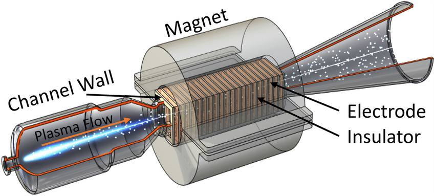 让高温的等离子体以极高的速度通过高强度磁场,然后在磁力线的垂直方向拾取出导电的等离子体切割磁力线产生的电流,这基本就是磁流体发电的原理。