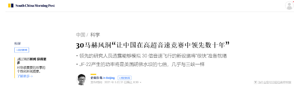 而我国正是风洞大国与强国,其中爆轰驱动的风洞技术更是全球顶尖。2021年5月31日,《南华早报》报道了中国30马赫的爆轰驱动JF-22风洞,其产生的功率是胡佛水坝的7倍,仅仅略小于三峡大坝。据中国科学院力学研究所的韩贵来博士称,这个风洞大约领先西方20~30年。