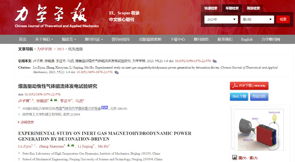 关于技术成果,已经于1月19日发布在《Chinese Journal of Theoretical and Applied Mechanics》(力学学报)上,标题为《爆轰驱动惰性气体磁流体发电试验研究》,下文就来介绍下,这到底是怎样一种技术。