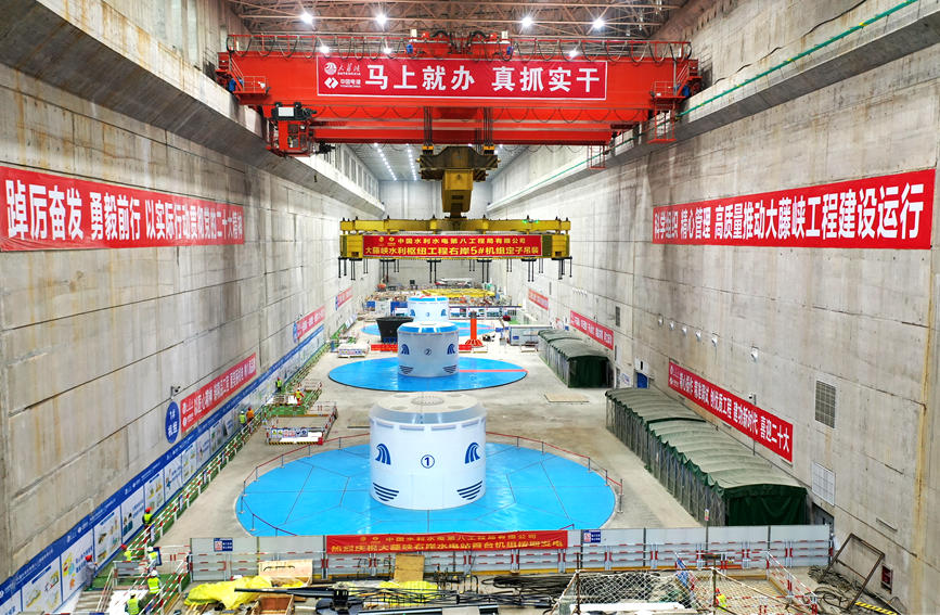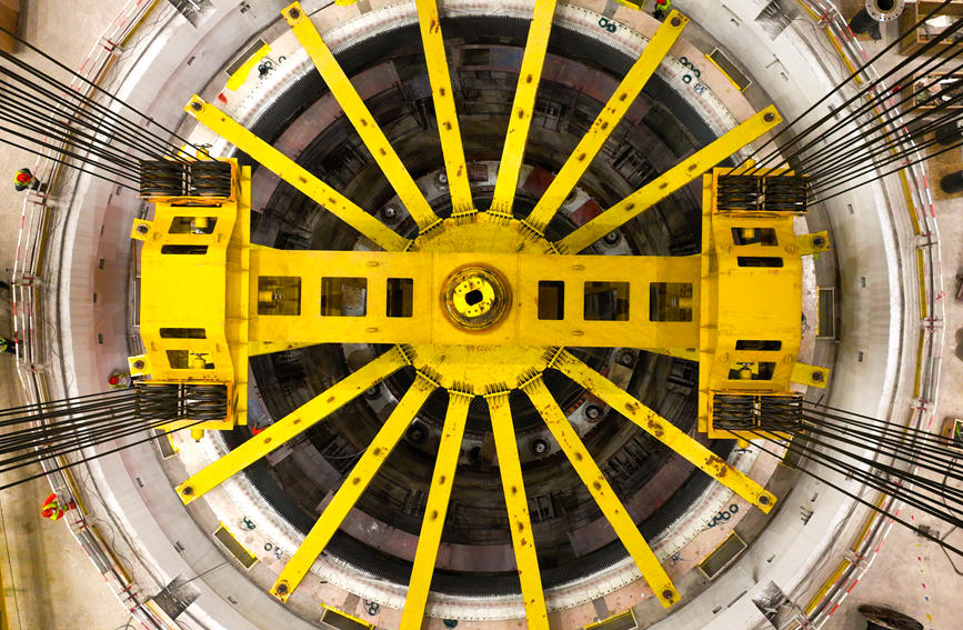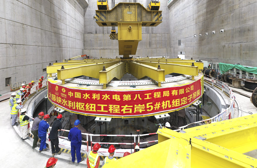 最后一台发电机组定子到达基坑预定位置,正在进行位置微调。李昆峰摄
