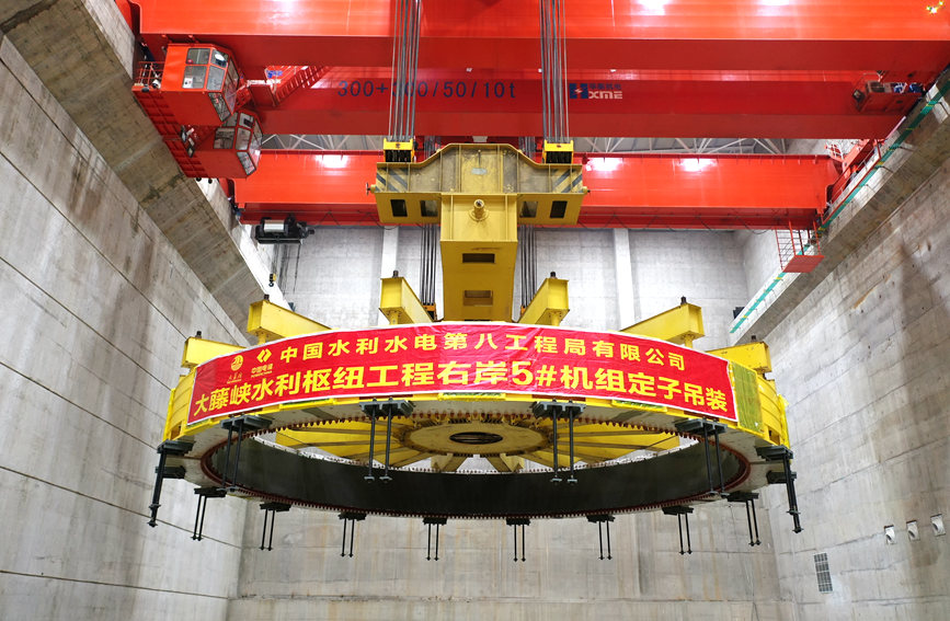 最后一台发电机组定子到达基坑预定位置,即将吊装成功。张成栋摄