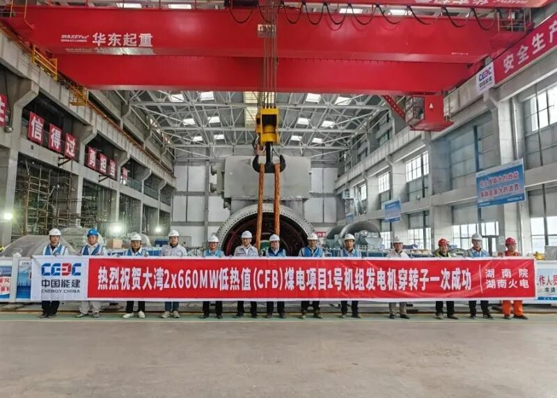 11月8日,中国能建湖南火电承建的贵州大湾2×660兆瓦低热值(CFB)煤电项目1号机组发电机穿转子一次成功。